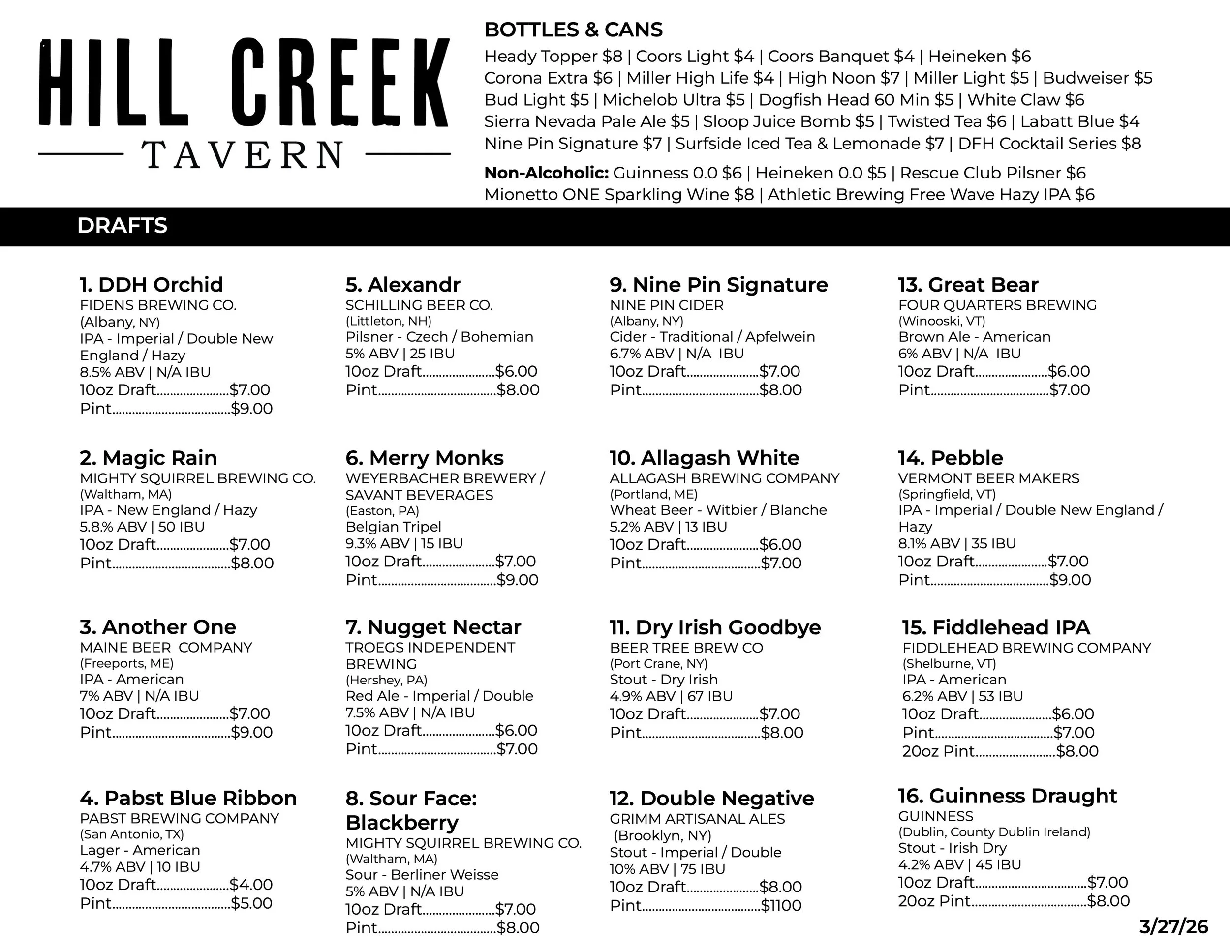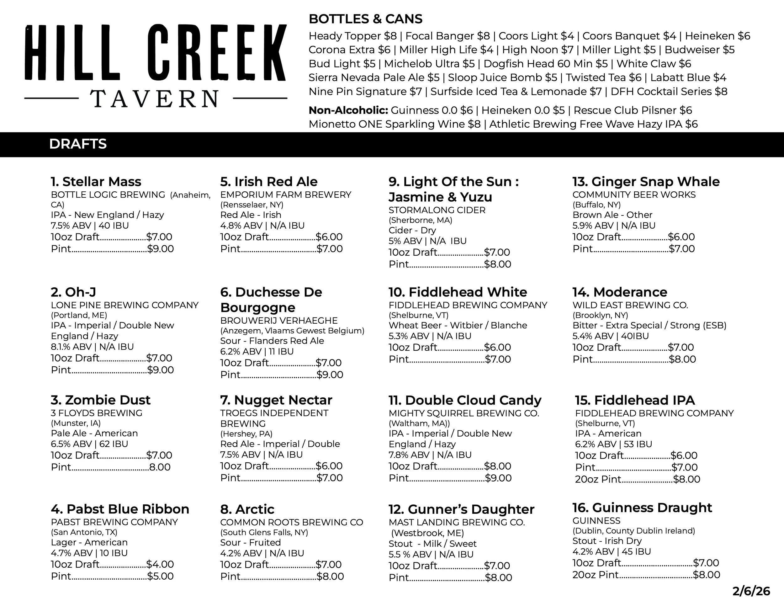 With 16 taps at Hill Creek, our beer and cider offerings are everchanging. Find the most current selection below!